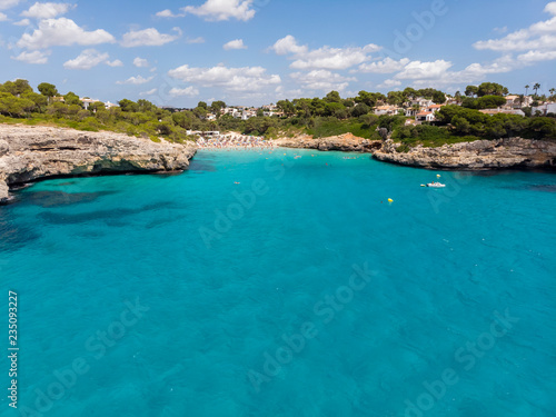 Aerial view, Spain, Balearic Islands, Mallorca, Porto Cristo Novo, Cala Mendia coast with villas and natural harbor