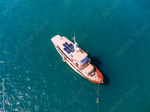 Aerial wonderful top view of a colorful interesting sail boat staying at the sea