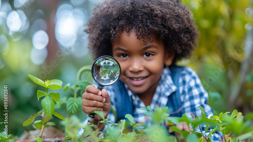 African american child looking through magnifying glass at plant seedling