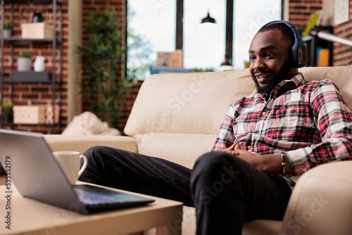 African american freelancer listening to music or podcast show on online website, using social media and headphones to work remotely. Working on laptop at home and enjoying song on internet at home.