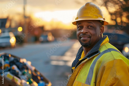 African American garbage removal man collecting trash and cleaning up on city streets.