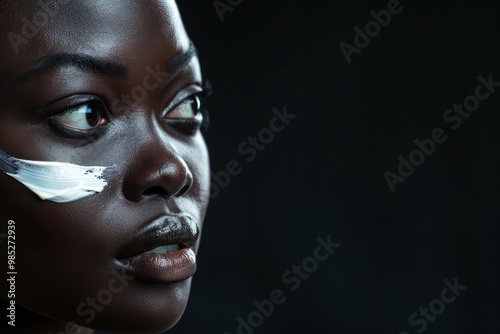 African American woman applies white cream on her face in a dark-studio setting, focusing on intimate skin care and facial beauty, showcasing makeup skills and dark skin tone contrast.