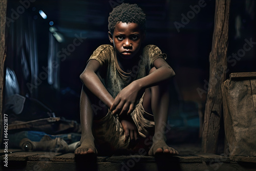 African Boy's Solitude, Mottled Shadows in Rustic Room