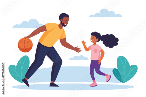 African Father Passing Basketball to Curly Haired Girl Outdoors on White Background