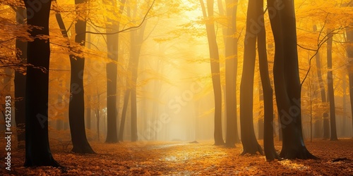 AI Generated. AI Generative. Autumn forest outdoor nature orange yellow park fall landscape background. Graphic Art