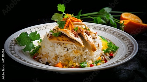AI generated illustration of a bowl of white rice topped with diced cooked chicken, shredded carrots