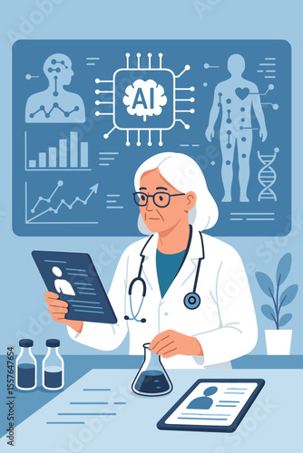 AI in healthcare concept. Senior female doctor or researcher analyzing patient data with artificial intelligence. Scientist in laboratory using technology for medical diagnostics. Vector.