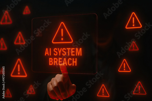 AI system breach warning with glowing red alert icons and finger pointing on transparent screen