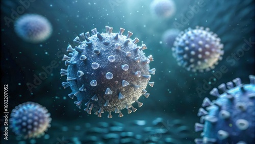 Ai threats healthcare systems glow as viral particle closeup floats blue micro world, textured surface and spikes convey urgent clinical risk