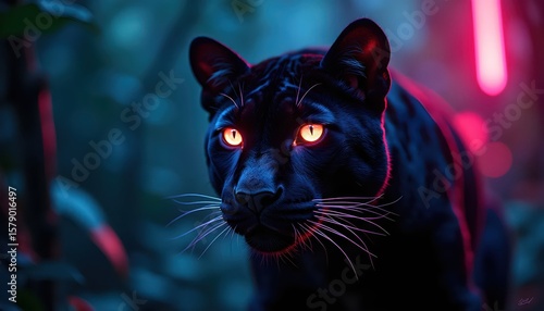 AI-generated panther in a futuristic sci-fi environment, glowing lines and intense blue gaze