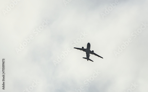 airplane flying through clouds (seen from below in dark silhouette against bright blue sky) shadow, outline of commercial airline plane seen from the ground