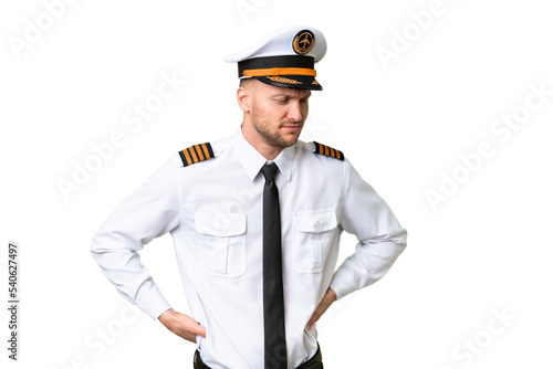 Airplane pilot man over isolated background suffering from backache for having made an effort