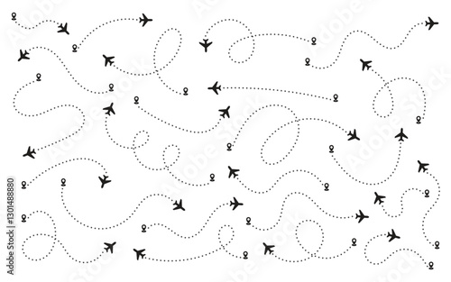 Airplane routes in dashed line trace set. Plane route lines tracking, location pins, planes, travel, map pins on white background.
