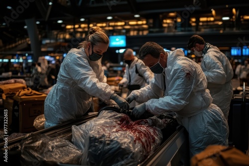 Airport personnel clad in protective gear meticulously investigate suspicious baggage covered in blood, amidst the busy backdrop of an airport terminal.