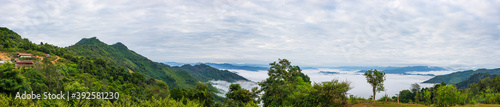 Akha village in the mountains of North Laos, sunset dramatic sky. Remote tribal village travel destination for tribal trekking, Akha ethnic group and minority.