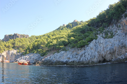 Alanya, TURKEY - August 10, 2013: Travel to Turkey. The waves of the Mediterranean Sea. Water surface. Mountains and hills on the coast of Turkey. Port. Green hills.