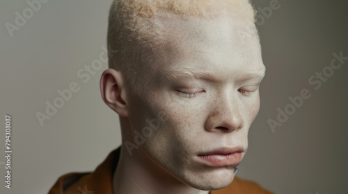 Albino man with a calm expression on a light background