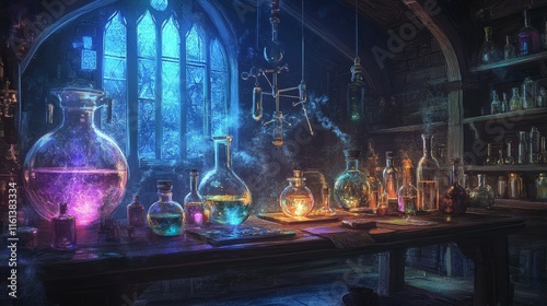 Alchemist experimenting with magical potions in his mysterious laboratory at night