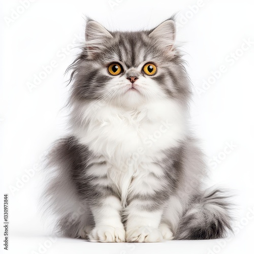 Alert Gray and White Kitten with Bright Yellow Eyes on White Background