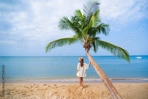 Alone woman traveler standing under a palm tree while relaxing on a tropical sandy island and enjoying idyllic and beautiful moment life