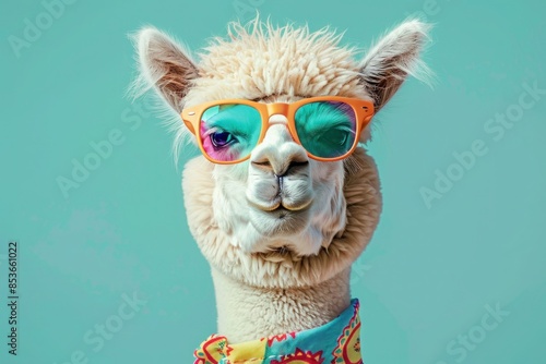 Alpaca with glasses and a scarf on her neck