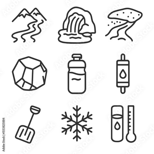 Alpine Water Source Icons. Line style icons of Alpine Water Sources: glacial melt stream, alpine spring, snowmelt rivulet, ice