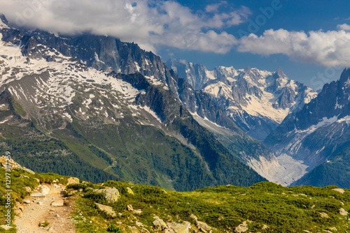 Alps scenic landscape on Tour du Montblanc. Rocky and snow summit peaks of the Alps on the trekking route TMB around Mont Blanc in Chamonix and Courmayeur. Alpine scene with mountains and lakes