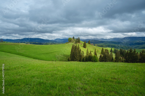 amazing spring (summer) mountain landscape. blue dramatic cloudy sky. natural background