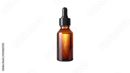 Amber dropper bottle containing transparent liquid on transparent background