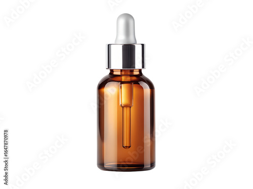 Amber glass bottle with dropper for serum or oil, isolated on transparent background
