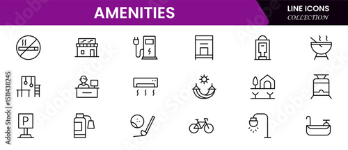amenities facilities line icons, hotel parking restaurant park swimming pool, Vector illustration