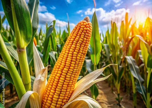Amidst a thriving organic corn field, a mature golden ear stands proud, boasting intact kernels that highlight the