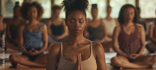 Amidst the serene ambiance of a wellness retreat, a group of attendees participates in a meditation workshop