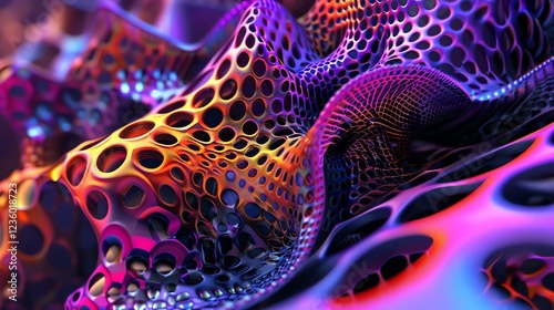 An abstract 3D image of a complex, organic, metallic structure in shades of purple, pink, blue, and orange.