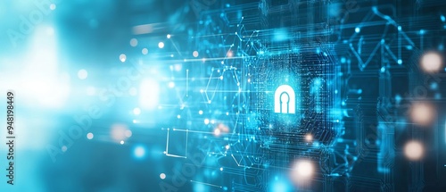 An abstract image of digital devices interconnected by secure credentials, with breach protection and proof of cybersecurity management floating around