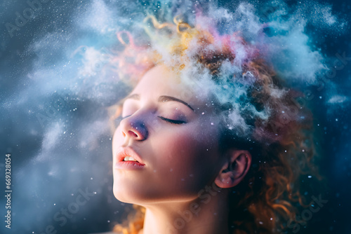 An abstract photo depicts the concept of a woman's mental struggle, symbolized by a head covered in icy blue snow. With her eyes closed, she appears to be crying, surrounded by a dark, melancholic rai