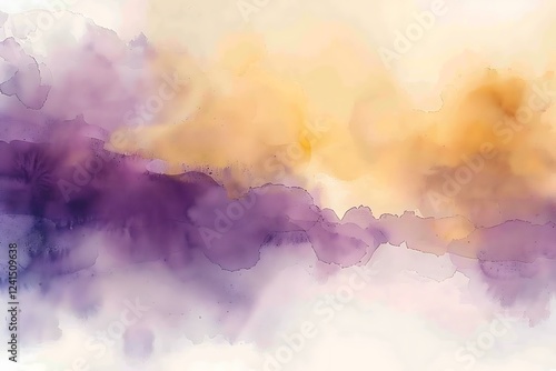 An abstract watercolor painting features a blend of purple, orange, and yellow hues. Soft, flowing colors create a dreamy, atmospheric effect. The image is dominated by a horizontal gradient.