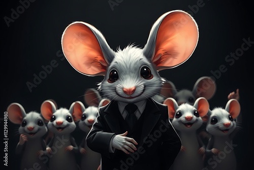 An animated mouse in a suit celebrating with arms raised, surrounded by cheering mice, symbolizing leadership, success, and individuality in a group setting.