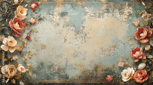 An antique-textured vintage frame with gold accents, set against a teal background with right-sided roses painted in a traditional style..