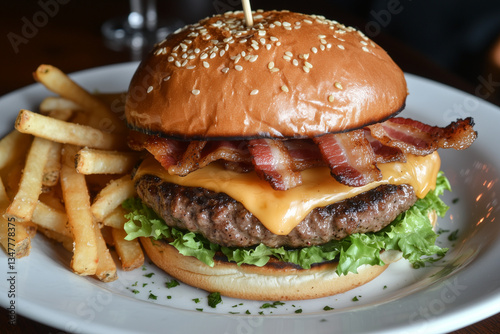 An appetizing bacon cheeseburger including a beef patty and lettuce