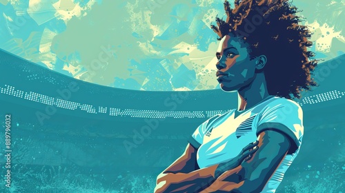 An artistic illustration of a football player stood strong and determined into the stadium with a teal color scheme, symbolizing commitment and resilience.