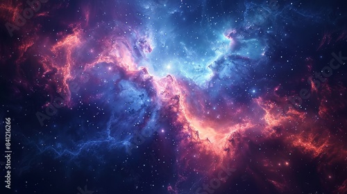 An artistic representation of a nebula, blending blues and pinks with a bright central star.