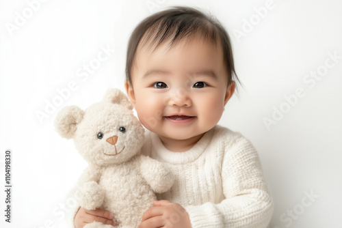 An Asian baby holding a small stuffed animal, sitting on a clean white backdrop with a gentle smile