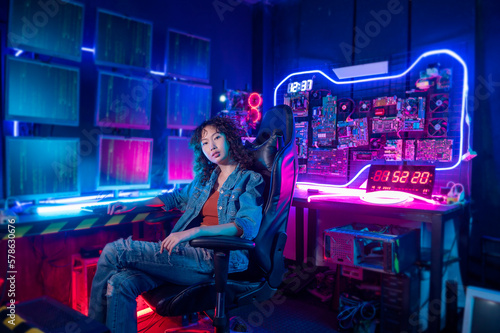 an asian woman programmer is working in her computer room , futuristic technology concept