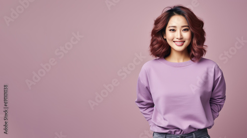 An Asian woman wearing purple sweatshirt isolated on pastel background