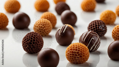 An assortment of various chocolates and caramel candies arranged in a pattern on a white background.