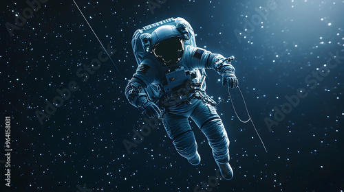 An astronaut floating outside a space station, holding onto a tether while performing maintenance in deep space, with stars scattered across the sky