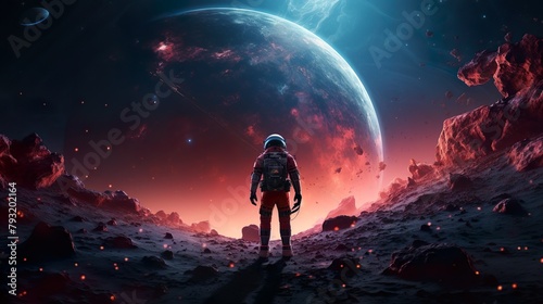 An astronaut stands looking at the large, looming planet amidst a red, rocky alien landscape