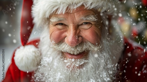 An authentic shot of Santa Claus in costume laughing heartily and nodding at the camera. He is ready to bring joy, gifts and presents to everyone this New Year's Eve.