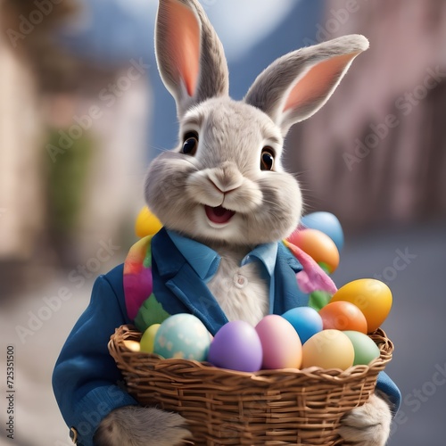 An Easter bunny rabbit holding a basket filled with colourful Easter Eggs